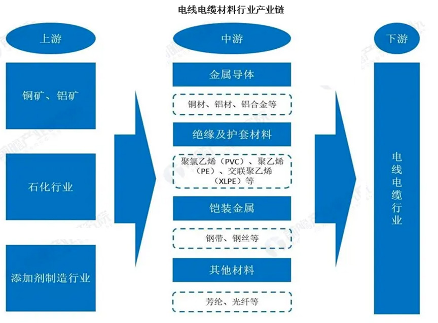 電線電纜用金屬材料(銅材、鋁材)上游主要原料為銅礦石、鋁礦石等,上游主要是采礦和冶煉階段,獲得銅材、鋁材加工的原材料;電線電纜用高分子材料生產(chǎn)中耗用的主要原材料為PVC樹脂、PE樹脂等,該類原材料主要由原油提煉而來,均屬于石化行業(yè)產(chǎn)品。電線電纜材料行業(yè)的下游是電線電纜行業(yè),電纜工業(yè)的大發(fā)展都是以新型線纜材料的開發(fā)與創(chuàng)新為主線。與此同時,下游行業(yè)對線纜材料行業(yè)的發(fā)展又具有較大的牽引和驅(qū)動作用,其需求的變化直接決定線纜材料行業(yè)的未來發(fā)展。